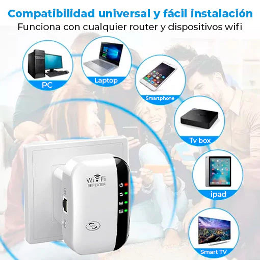 Compatible con cualquier dispositivo de red que cumpla con el estándar 802.11N/B/G, incluyendo routers, módems, smartphones, tabletas, laptops y Smart TVs.