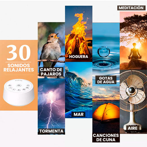 Proporciona 30 sonidos relajantes, incluyendo sonidos de mantra, olas, lluvia, viento, pájaros cantando, canciones de cuna y mucho más.