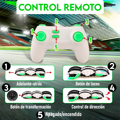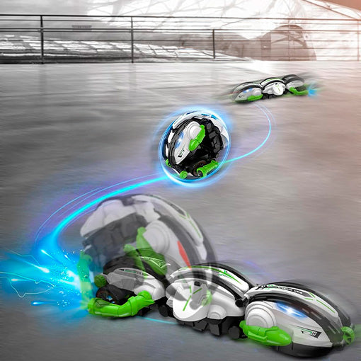 el auto se transforma sin problemas en una bola, listo para sorprender y entretener. Está diseñado para resistir caídas y colisiones, superando con gran éxito diferentes terrenos difíciles.