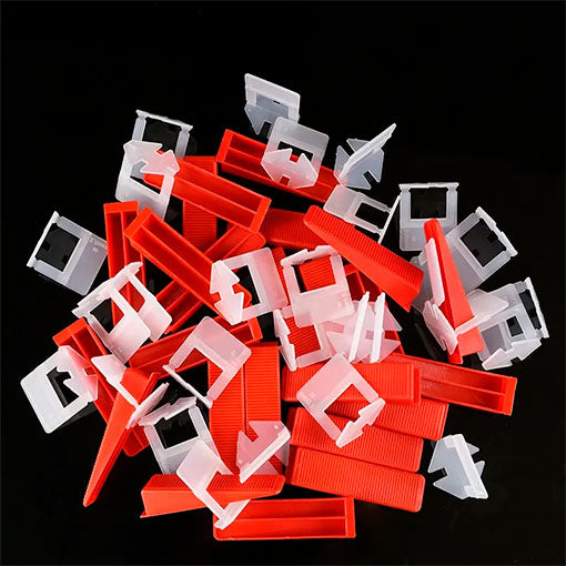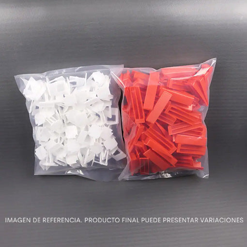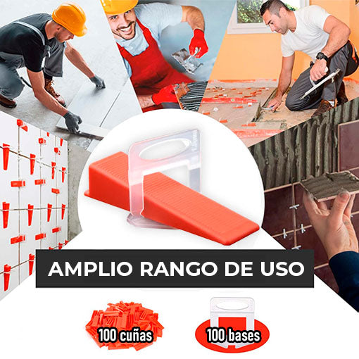 Este kit está diseñado para lograr una nivelación perfecta entre revestimientos, y separaciones parejas entre uniones. El kit está compuesto por CUÑAS NIVELADORAS (reutilizables) y BASES AUTONIVELANTES (no reutilizables)