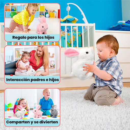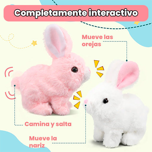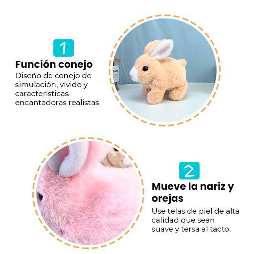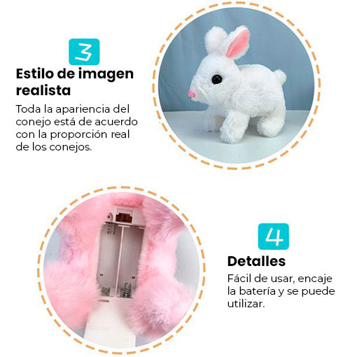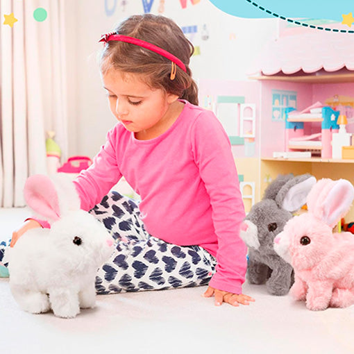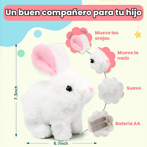 Chilla, mueve la nariz, salta y mueve las orejas como un conejito real. Con solo encender el interruptor, este conejito cobrará vida. Fabricado con felpa suave y segura, es perfecto para niños pequeños. Además, fomenta el desarrollo cognitivo y emocional al permitir que los niños imaginen ser los dueños de una mascota.