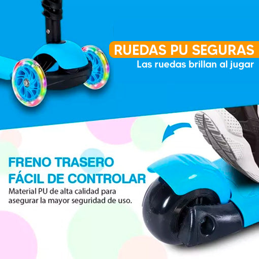 ¡Haz de cada paseo una nueva aventura! Equipado con un asiento desmontable, respaldo cómodo, y varilla de empuje para los padres, este scooter se convierte en la diversión más segura y duradera para los pequeños. Además, sus ruedas de luces LED aseguran visibilidad y un toque divertido en cada recorrido.