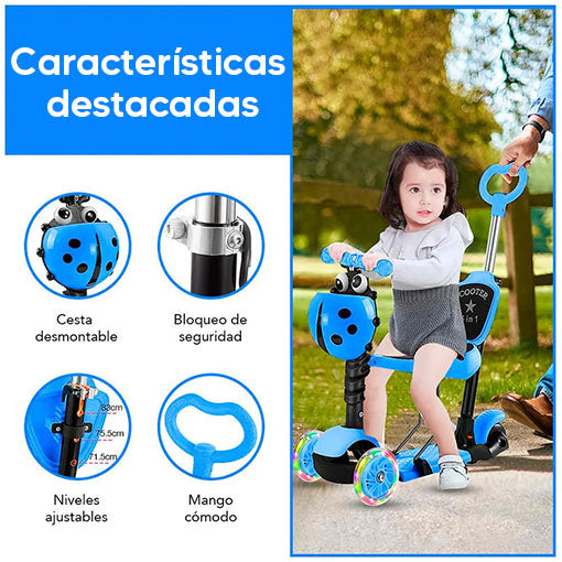 Nuestro Scooter Infantil Ajustable 5 en 1 está diseñado para adaptarse a cada etapa de su desarrollo, ofreciendo hasta 5 modos de uso en un solo producto. Ya sea como andador, triciclo o monopatín, este scooter evoluciona con tu hijo desde sus primeros pasos hasta sus grandes recorridos, brindando diversión segura y duradera.
